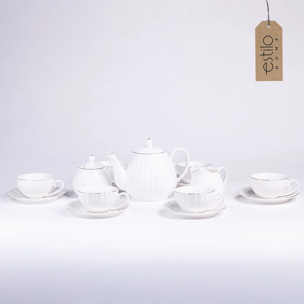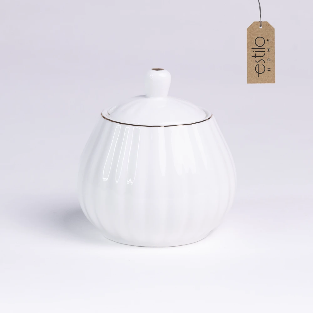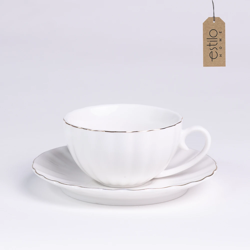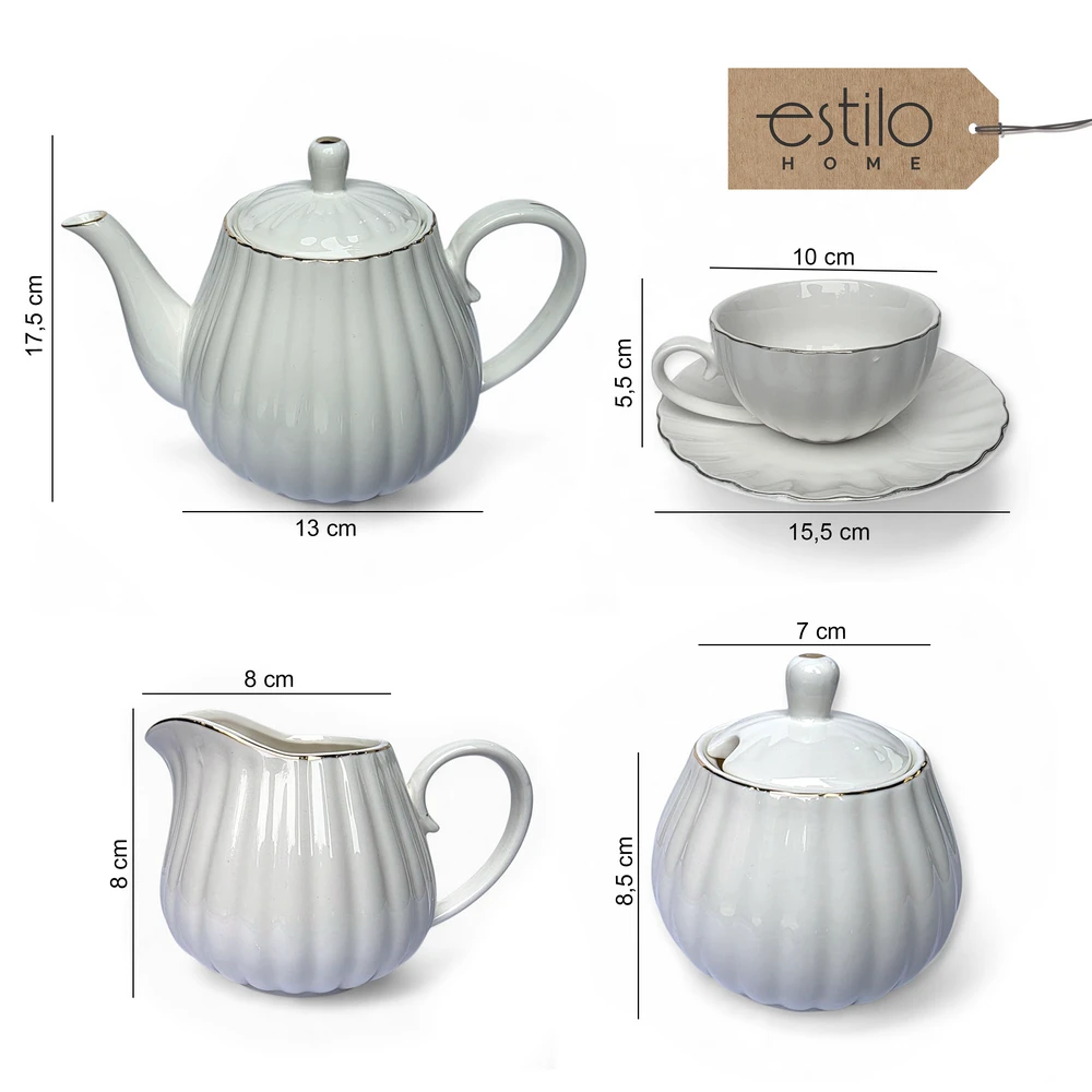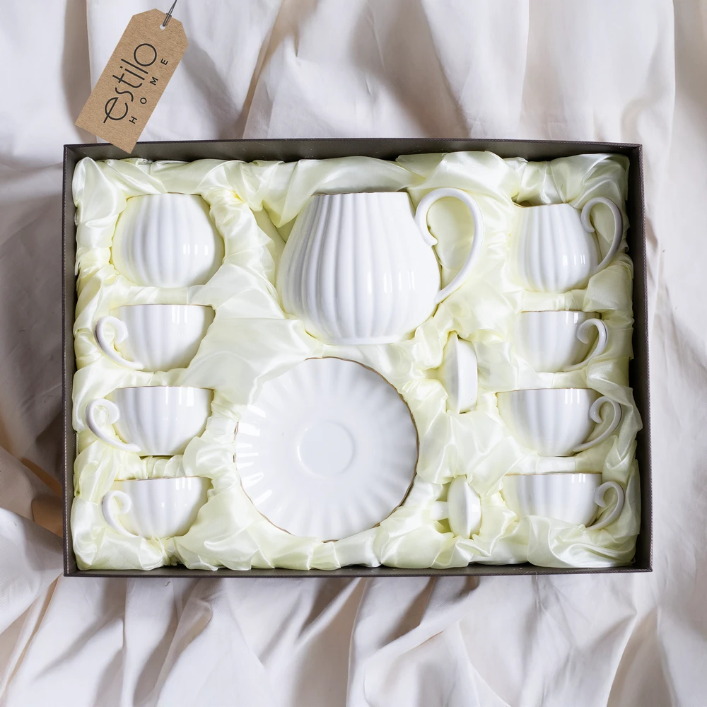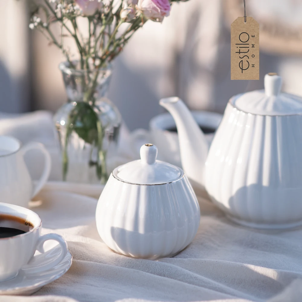 Ten wyjątkowy biały zestaw kawowy ze złotymi zdobieniami to połączenie stylu, funkcjonalności i elegancji. Idealny zarówno do codziennych chwil z filiżanką ulubionej kawy, jak i podczas uroczystych spotkań z rodziną czy przyjaciółmi. Jego subtelny, klasyczny design z delikatnym złotym paskiem na brzegach filiżanek, talerzyków i dodatków sprawia, że świetnie komponuje się z każdym wnętrzem.