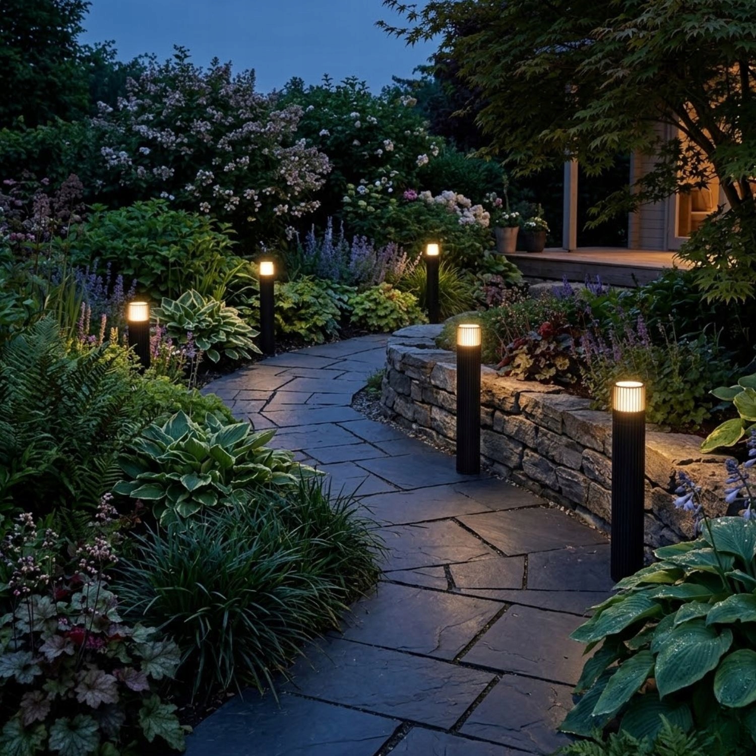 - Rabaty kwiatowe: Skierowane w dół światło wydobywa barwy kwiatów i teksturę krzewów ozdobnych.