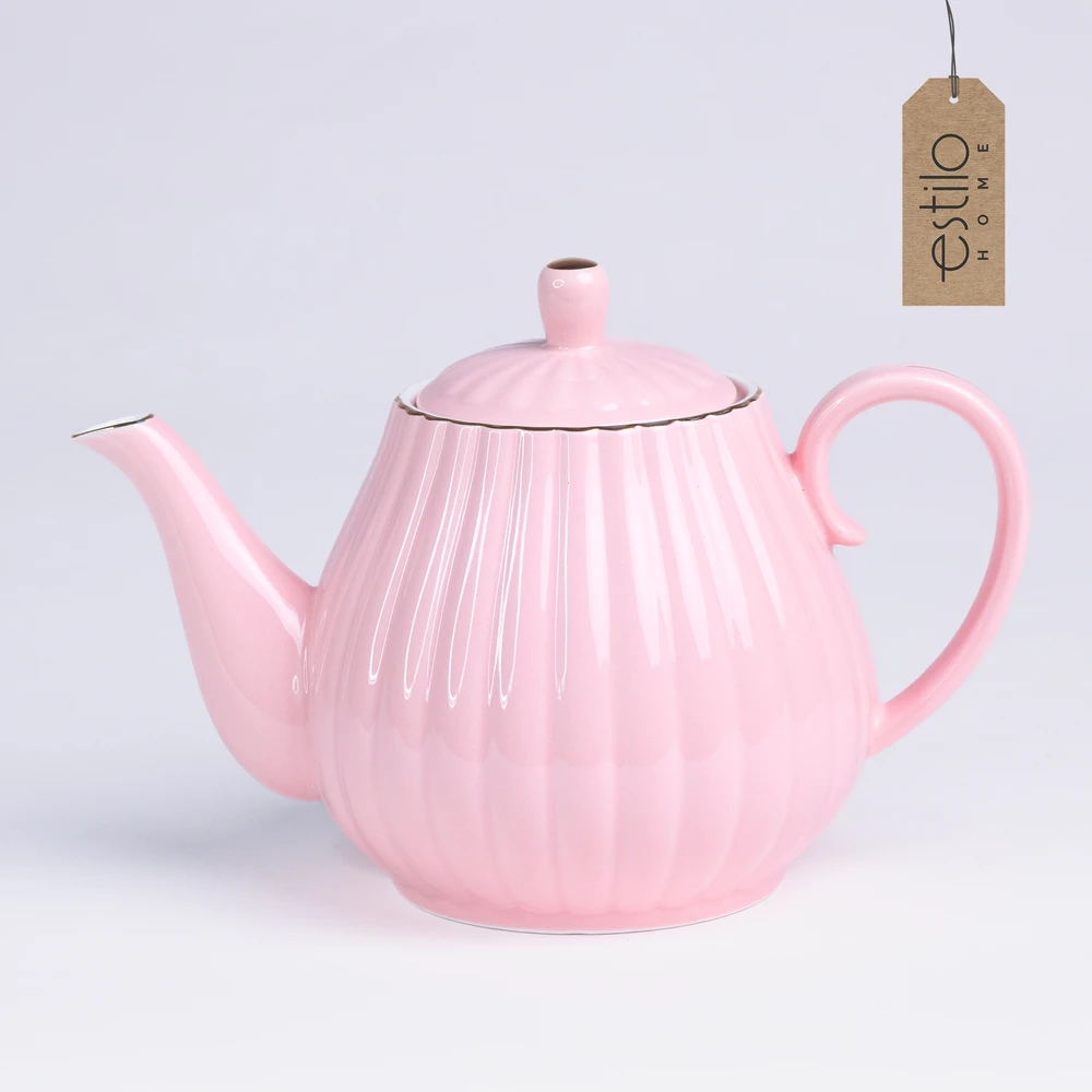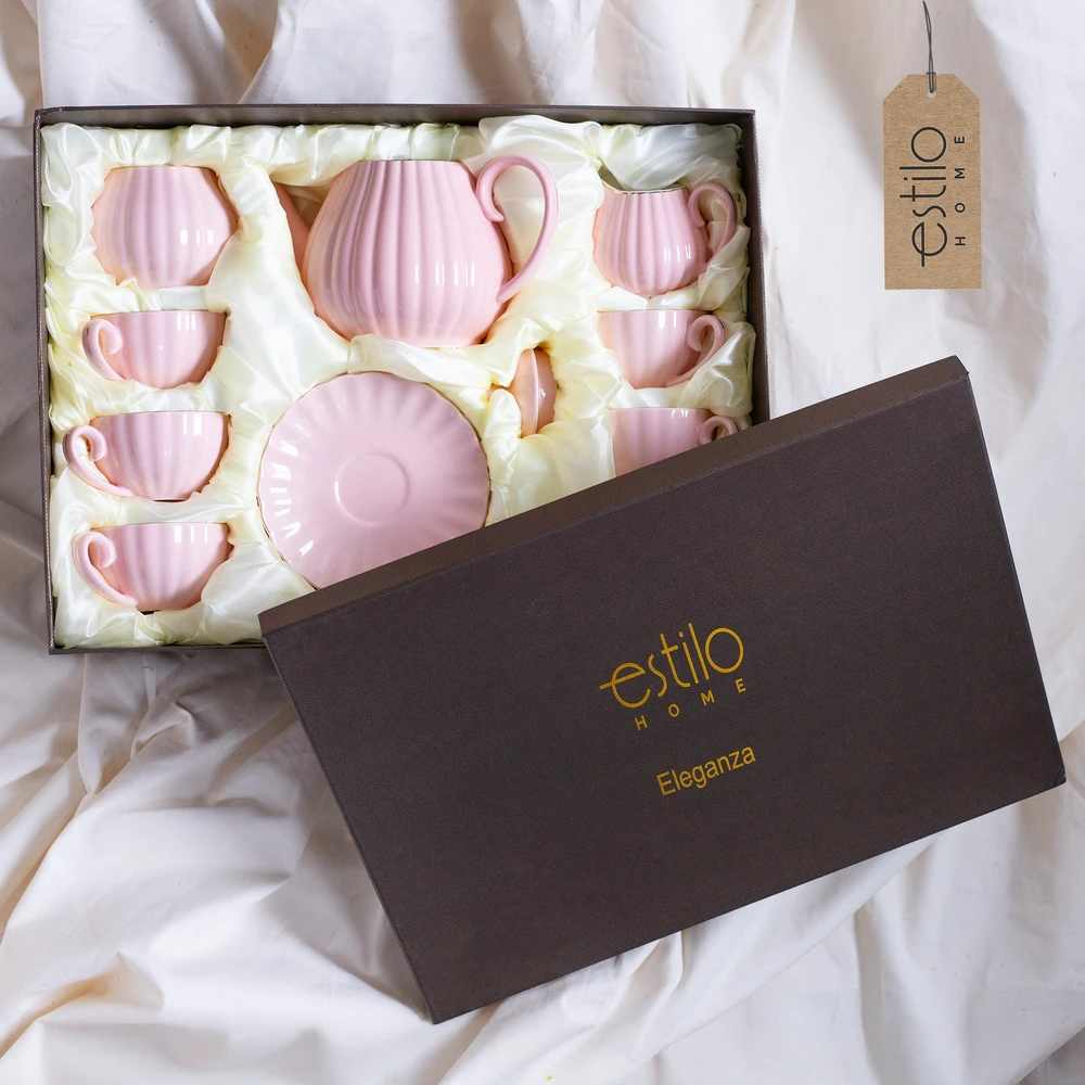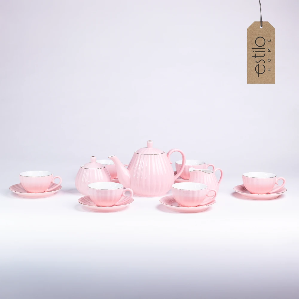Całość utrzymana jest w delikatnym różowym kolorze, a wykończona złotym paskiem na brzegach filiżanek, talerzyków i dodatków. Złote akcenty subtelnie połyskują, podkreślając wyjątkowy charakter zestawu i nadając mu klasy premium.
