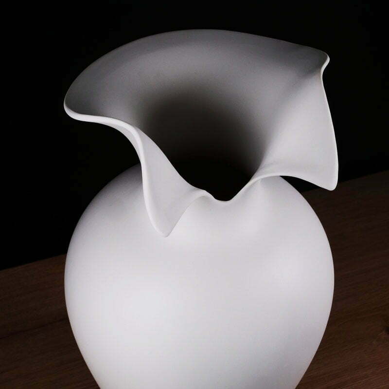 Wyjątkowy wazon dla kreatywnych osób. Największą zaletą tego wazonu, oprócz znakomitego designu, jest możliwość dekorowania go w dowolny praktycznie sposób. Nie tylko wsad (kwiaty, liście, gałązki) zmienią jego wygląd ale również apaszka, kokardka czy ozdobny szalik zawiązany na kołnierzu wazonu mogą nadać mu całkowicie nowego wyglądu. Tym samym łatwo i kreatywnie możemy zmieniać harakter wnętrza w którym ten designerski duży wazon może być postawiony.