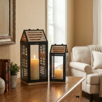 Odkryj wyjątkowy lampion w kształcie domku. Połączenie czarnego metalu i naturalnego drewna. Idealny do salonu w stylu loft, industrial, nowoczesny i klasyczny.